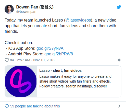 Facebook was strangely silent about Lasso’s launching, using no official announcement on its site. It was just on Twitter which Facebook product director Andy Huang declared the program’s launch, and afterward Bowen Pan, the item director for Lasso especially, tweeted relating to it.